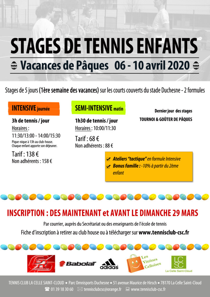 Merci de compléter le fichier Stage Jeunes Pâques 2020, de le renvoyer par mail à tennisclubcsc@orange.fr, de le déposer au club House ou auprés de vos professeurs ou bien de l’envoyer par la poste au 51 avenue Maurice de Hirsh 78170 La Celle Saint Cloud.