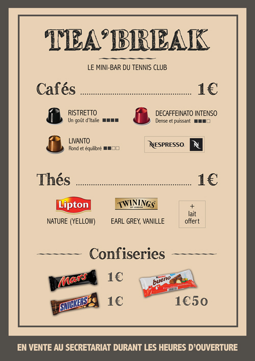 carteTeaBreak_mars2014_500x707carteTeaBreak_mars2014_500x707Comme de nombreux adhérents le voulaient depuis longtemps, il est désormais possible de prendre du café, du thé et d’acheter des barres énergétiques au club-house grâce à notre mini-bar TEA’BREAK. En vente auprès du secrétariat aux heures d’ouverture. Si vous avez des suggestions pour compléter la carte, faites les nous connaître.