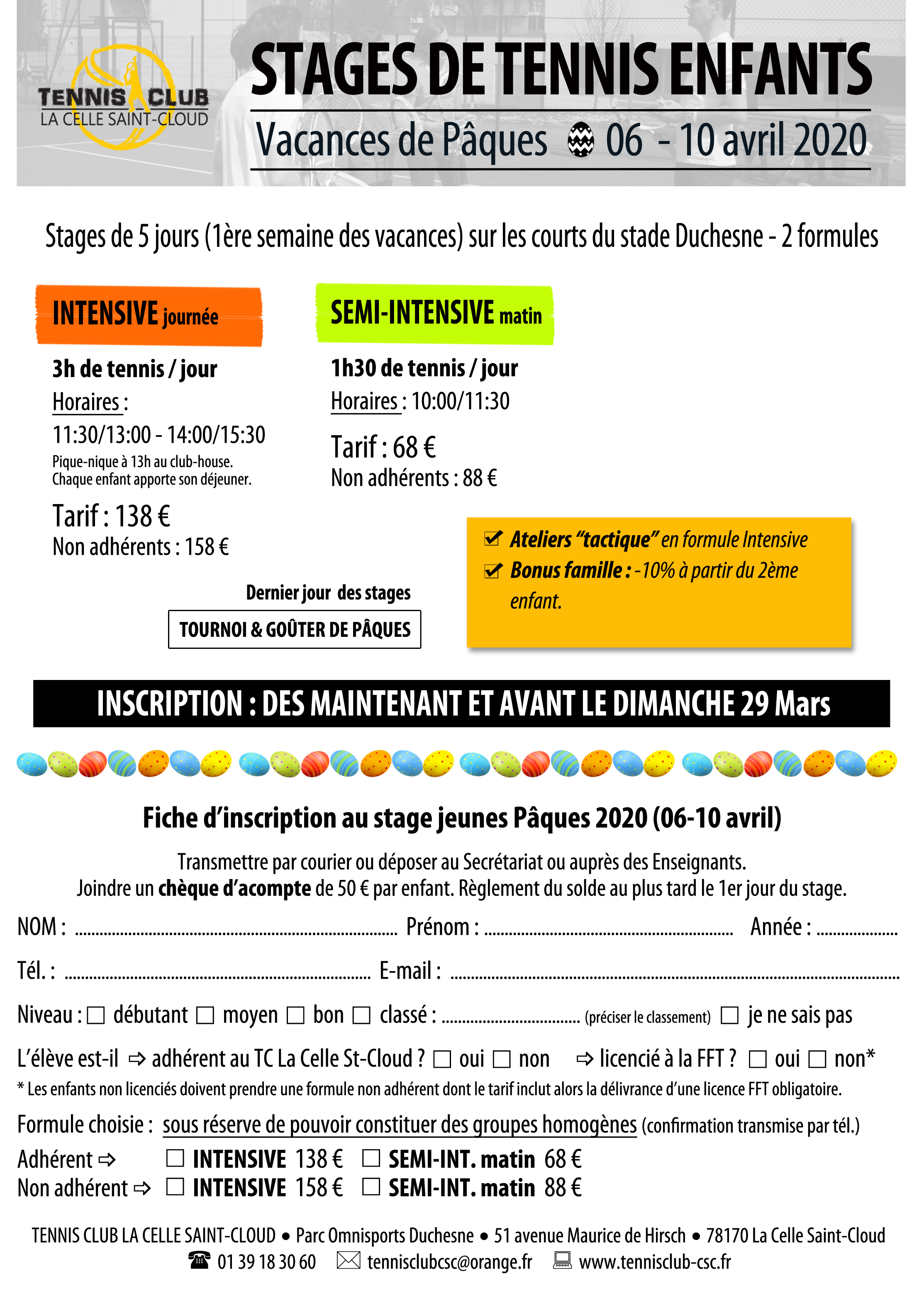 Merci de compléter le fichier Stage Jeunes Pâques 2020, de le renvoyer par mail à tennisclubcsc@orange.fr, de le déposer au club House ou auprés de vos professeurs ou bien de l’envoyer par la poste au 51 avenue Maurice de Hirsh 78170 La Celle Saint Cloud.