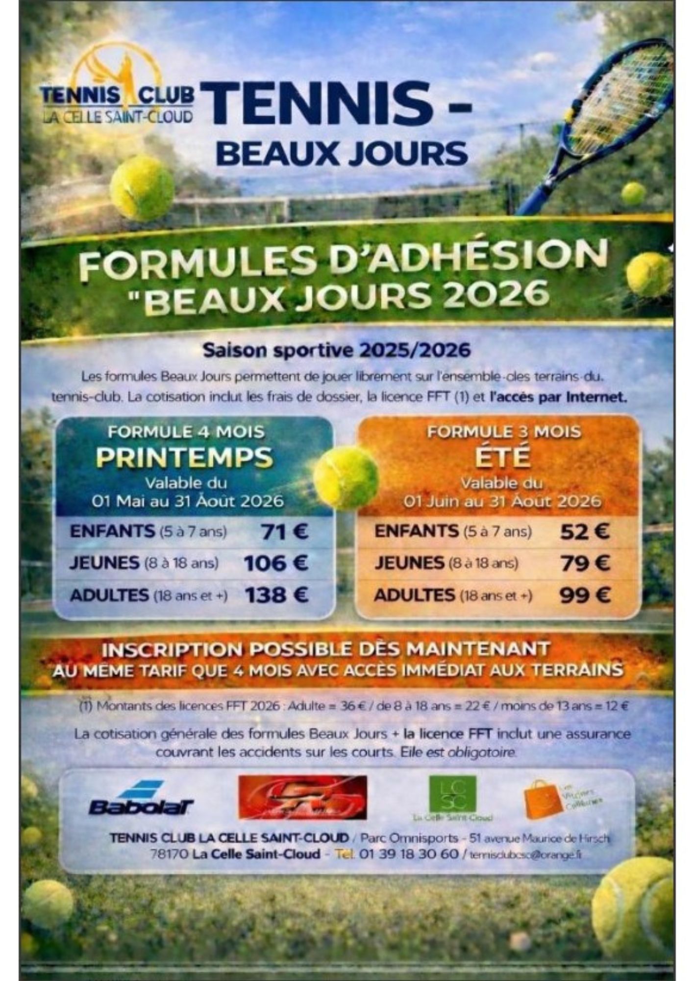 L’adhésion est obligatoire pour être membre du Tennis Club La Celle Saint-Cloud. Elle autorise l’accès aux installations de tennis municipales mises à la disposition exclusive du club.