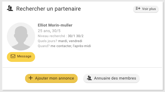 Ballejaune vous permet de publier très facilement une annonce si vous recherchez un ou des partenaires de jeu. Utilisez pour cela l’encadré Rechercher un partenaire qui se trouve sur votre page d’accueil et vous permet :